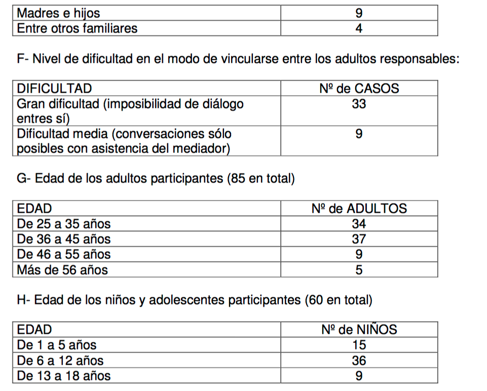 Trabajábamos con las familias y su red. En todos los momentos del proceso manteníamos contacto telefónico y/o entrevistas con los diversos profesionales actuantes, los abogados de cada uno, psicoterapeutas, mediadores, maestros, etc., teniendo siempre presente la inclusión de integrantes de la red familiar y social.