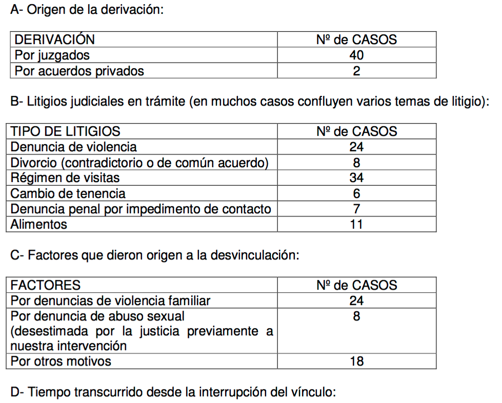 Trabajábamos con las familias y su red. En todos los momentos del proceso manteníamos contacto telefónico y/o entrevistas con los diversos profesionales actuantes, los abogados de cada uno, psicoterapeutas, mediadores, maestros, etc., teniendo siempre presente la inclusión de integrantes de la red familiar y social.