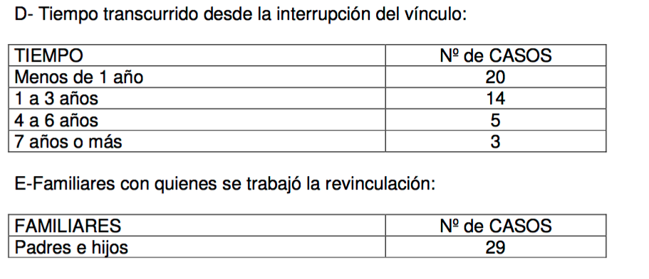 Cuando la intervención era solicitada por el juzgado se mantenían conversaciones con el mismo, que permitan la coordinación pertinente a cada caso: solicitud de antecedentes, participación en audiencias, presentación de informes periódicos de la evolución del proceso de revinculación.